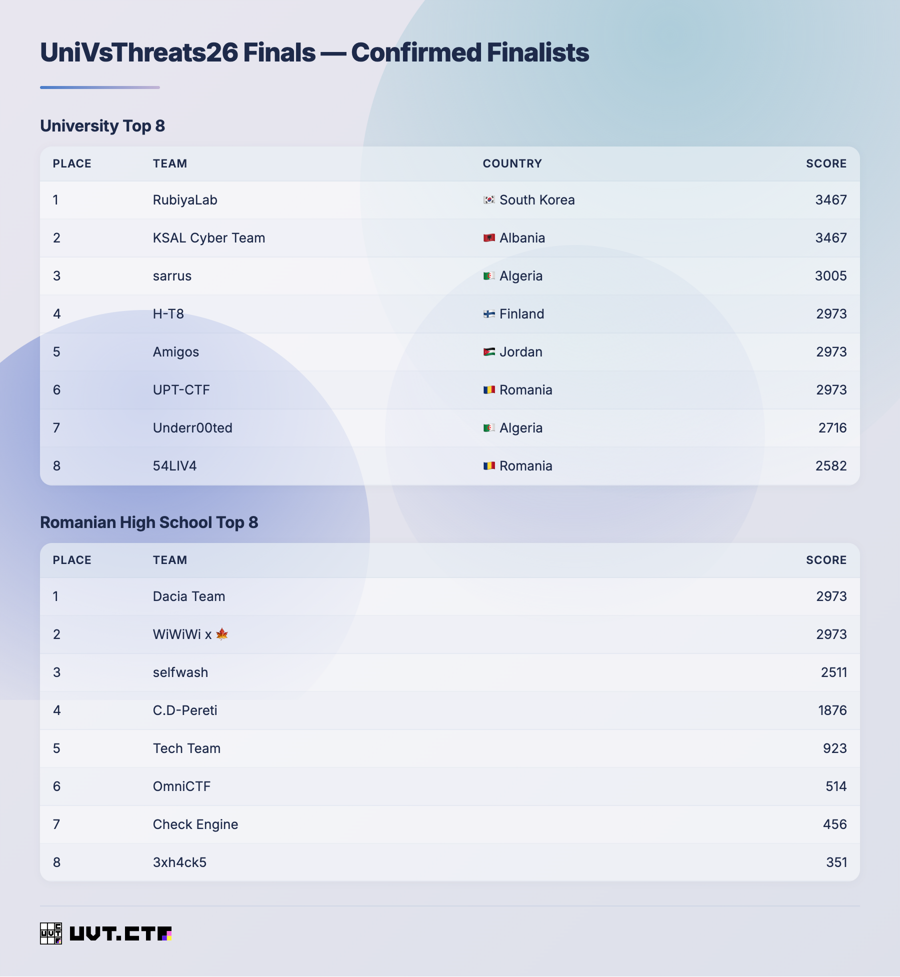 After the end of the UniVsThreats 26 qualifiers, write-ups were submitted, reviewed, and final confirmations were received. The qualifiers brought together 565 registered teams, 314 scoring teams, and 2,029 total solves across 23 challenges.
